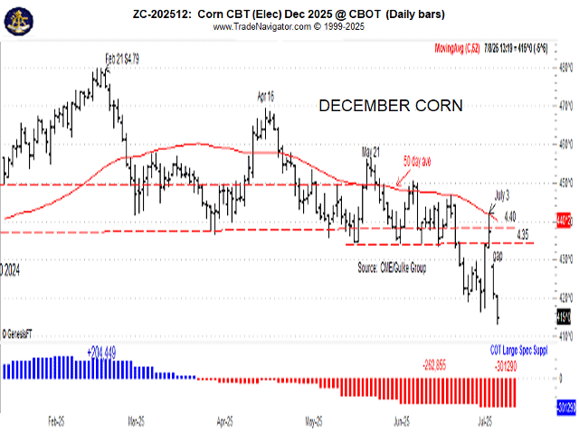 The trend for August soybean futures is sideways for now. Soybean futures collapsed to three-month lows over the most recent weeks as bearishness over the friendly growing season weather thus far and nearby forecasts, along with nervousness about new crop export demand has overwhelmed the market. The July WASDE seemed to validate the export concern as USDA reduced its 2025-26 forecast by 70 million bushels, although slightly offsetting this with a shift towards more crush. The result was a 15 mb increase to 2025-26 ending stocks but it is clear that bearish traders are currently penciling in the 5 mb production cut as temporary due to USDA’s reluctance to change yield estimates in the July WASDE. Still, soybean stocks in the U.S. are forecasted for a yearly decline for the first time since 2022-23, and the balance sheet may have to rely heavily on the record yield to keep stocks north of 300 mb. Soybeans are currently still seen as a neutral, Type 3 market.